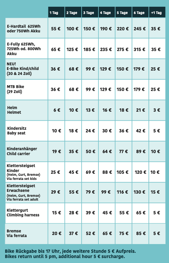 Wir statten euch mit der neuesten Qualitätsausrüstung aus. In unserem Ski- und E-Bike Verleih findet ihr nur Top-Marken wie Dynafit, Apache, Mammut, … Mit bestem Equipment machen Bergtouren doppelt Spaß!